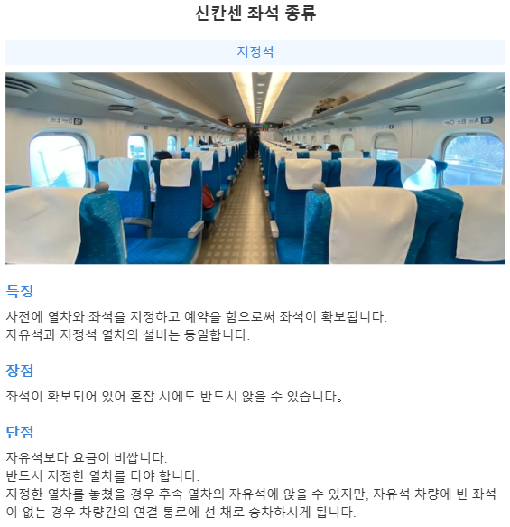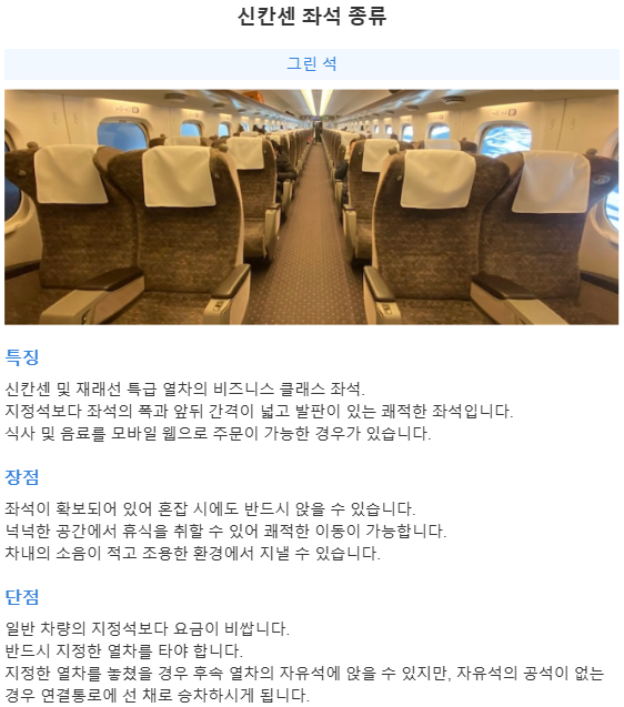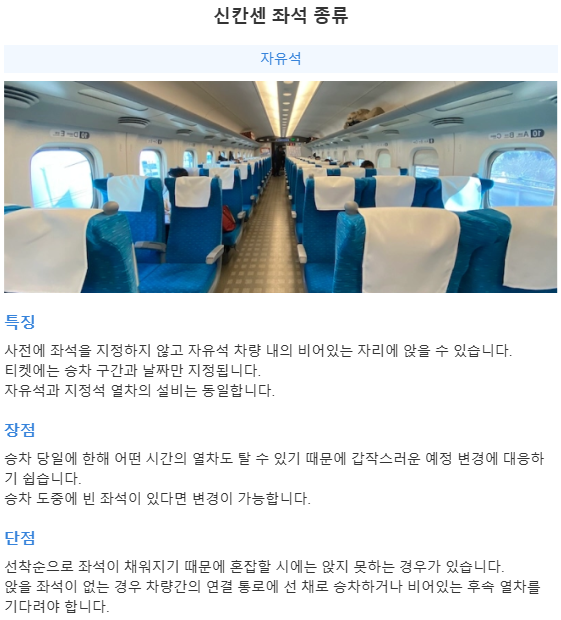 신칸센은 안전이 최우선이며 첨단 기술은 지진과 같은 비상 상황에서도 승객을 안전하게 보호합니다. 신칸센 열차 내부는 넓은 좌석과 편안한 리클라이닝 기능을 갖추고 있으며, 일부 객실에는 전원 콘센트와 무료 Wi-Fi도 제공되어 편리한 여행을 지원합니다. 또한, 보통석 (일반석), 그린카 (1등실), 그리고 고급스러운 그란 클래스와 같은 다양한 서비스 클래스를 선택할 수 있습니다.