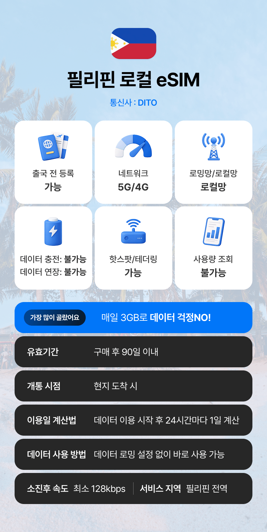 필리핀 전역에서 사용할 수 있는 끊김없고 간편한 eSIM으로 여행을 즐기세요!