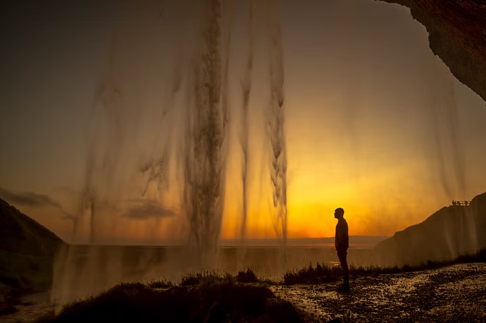 ・ 장엄한 폭포 셀야란드포스 뒤를 걷는 스릴, 자연의 경외감을 불러일으키는 힘과의 만남