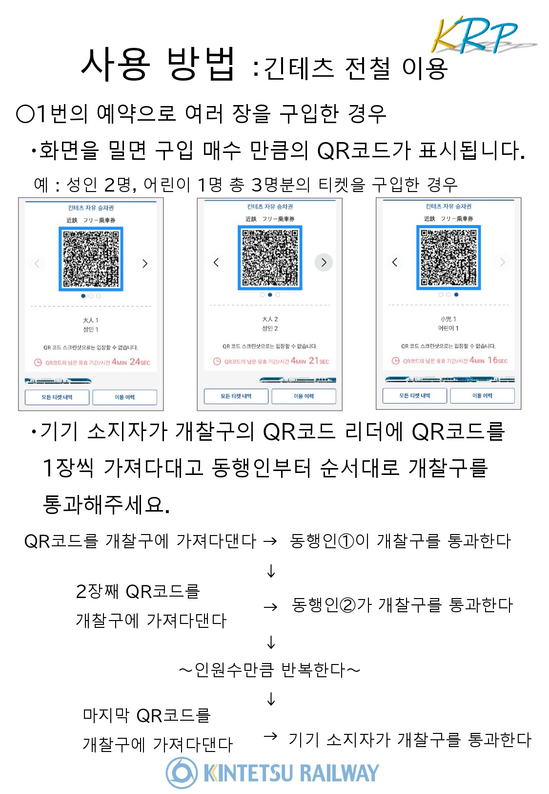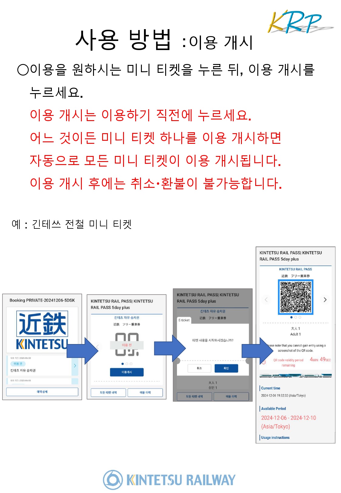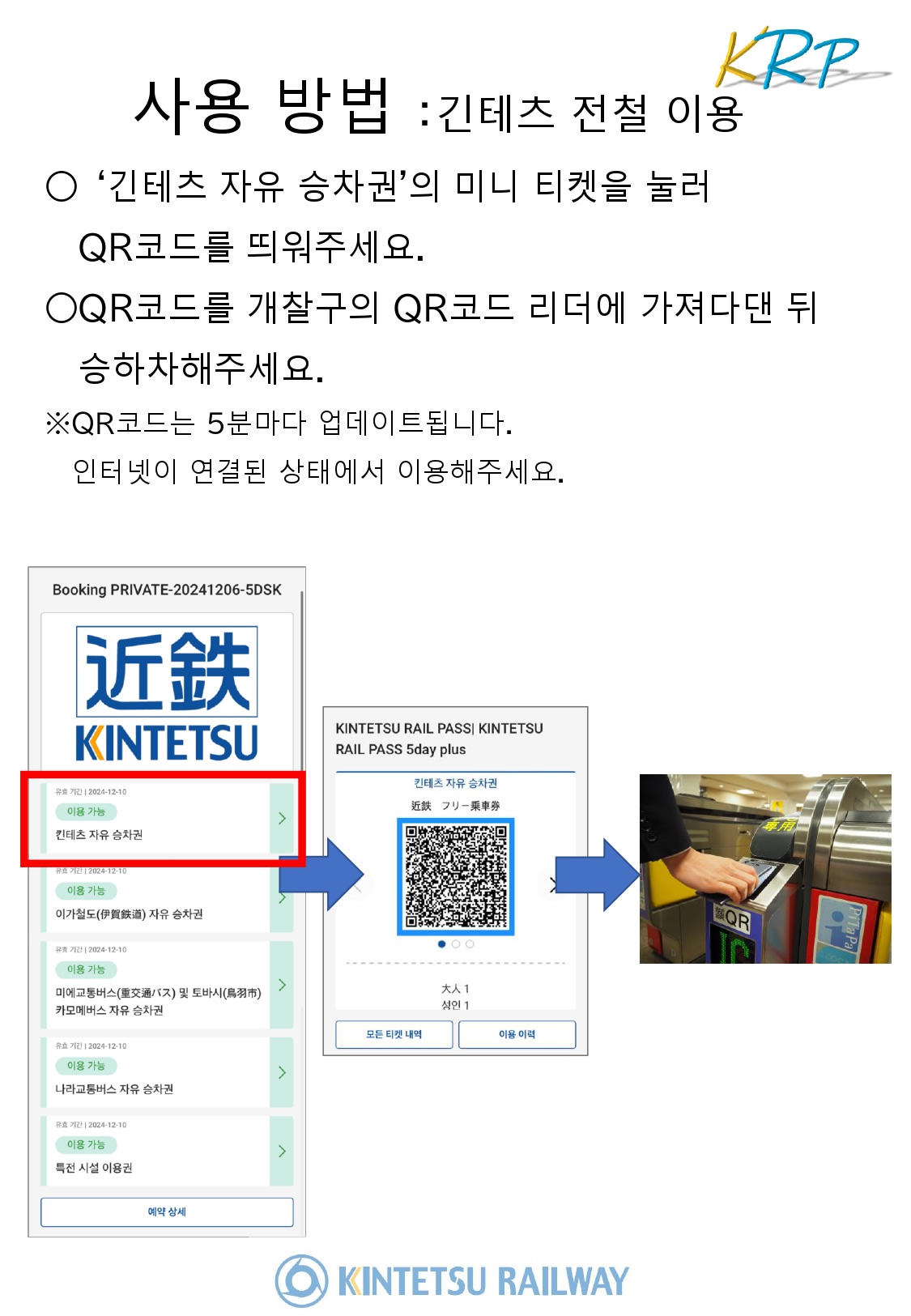 ・디지털 티켓 KINTETSU RAIL PASS로 저렴하고 편리하게 간사이를 마음껏 즐기세요! 1일권, 2일권은 오사카, 나라, 교토 5일권 및 5일 플러스는 오사카, 나라, 교토, 미에(이세시마), 나고야를 자유롭게 여행할 수 있습니다. <플랜 목록> KINTETSU RAIL PASS 5일권 KINTETSU RAIL PASS 5일 plus KINTETSU RAIL PASS 1일권 KINTETSU RAIL PASS 2일권■ 상품 설명[킨테츠 자유 승차권]- 오사카, 교토, 나라의 킨테츠선 지정 구간인 오사카 난바(大阪難波)~킨테츠 나라(近鉄奈良), 교토(京都)~츠츠이(筒井), 나가타(長田)~이코마(生駒), 토리이마에(鳥居前)~이코마 산죠 구간(生駒山上間)에서 자유롭게 승하차 가능합니다. ★사용방법- 오사카 난바(大阪難波)~킨테츠 나라(近鉄奈良), 교토(京都)~츠츠이(筒井), 나가타(長田)~이코마(生駒間) 구간에서 승하차 시, QR 코드를 자동 개찰기에 설치된 QR 코드 리더기에 스캔하여 사용.- 자동 개찰기가 설치되지 않은 역에서의 승하차는 승무원 또는 인터폰을 통해 처리되며, 승하차에는 시간이 소요될 수 있습니다.*지정 구간 외에서는 승하차할 수 없습니다.