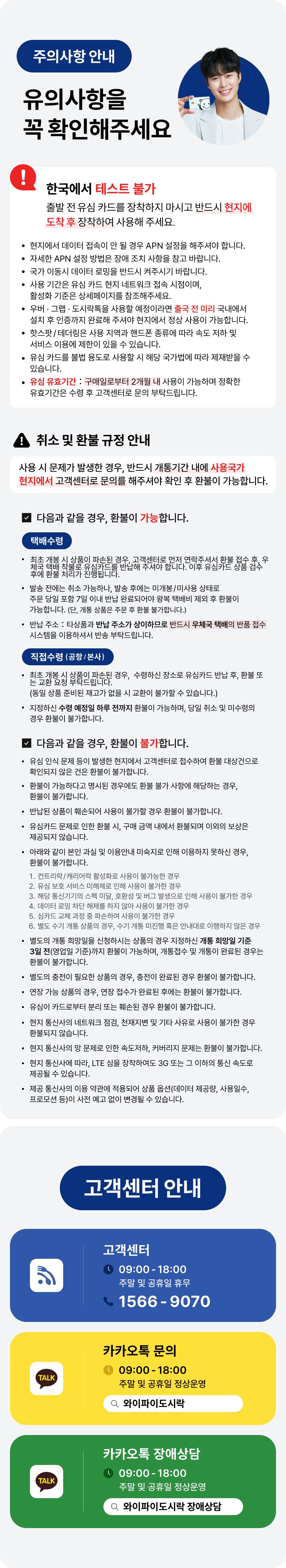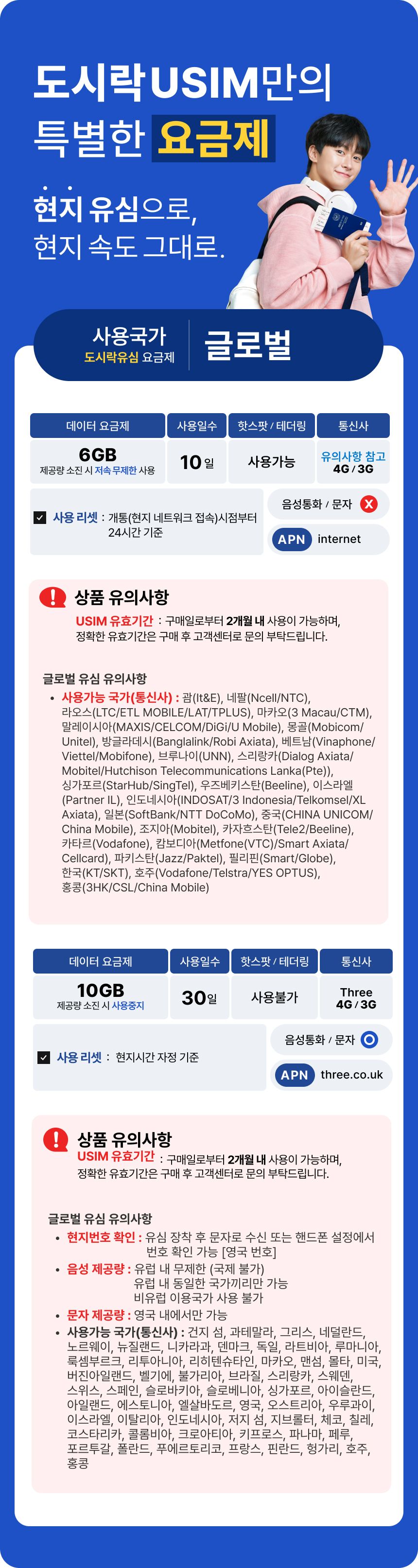① 단말기 컨트리락 미해지, 휴대폰 보호서비스 가입, 데이터로밍 차단 시 해외유심 사용이 어렵습니다.