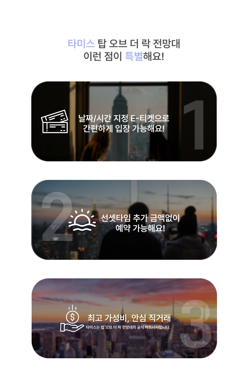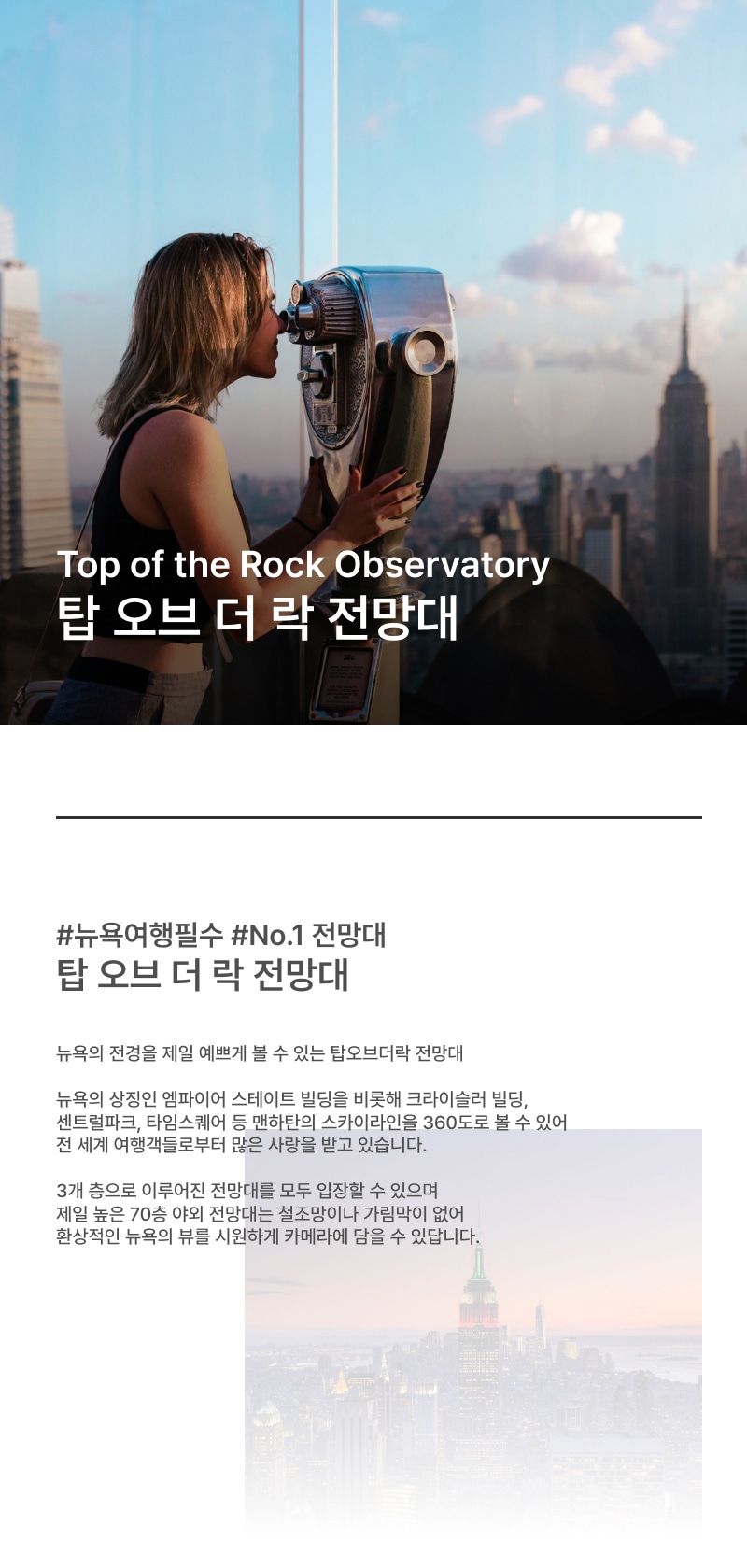 ・뉴욕의 전경을 제일 예쁘게 볼 수 있는 탑오브더락 전망대. 뉴욕의 상징인 엠파이어 스테이트 빌딩을 비롯해 크라이슬러 빌딩, 센트럴파크, 타임스퀘어 등 맨하탄의 스카이라인을 360도로 볼 수 있어 전 세계 여행객들로부터 많은 사랑을 받고 있습니다. 3개 층으로 이루어진 전망대를 모두 입장할 수 있으며 제일 높은 70층 야외 전망대는 철조망이나 가림막이 없어 환상적인 뉴욕의 뷰를 시원하게 카메라에 담을 수 있답니다.