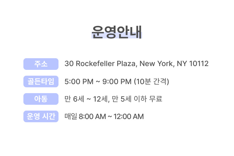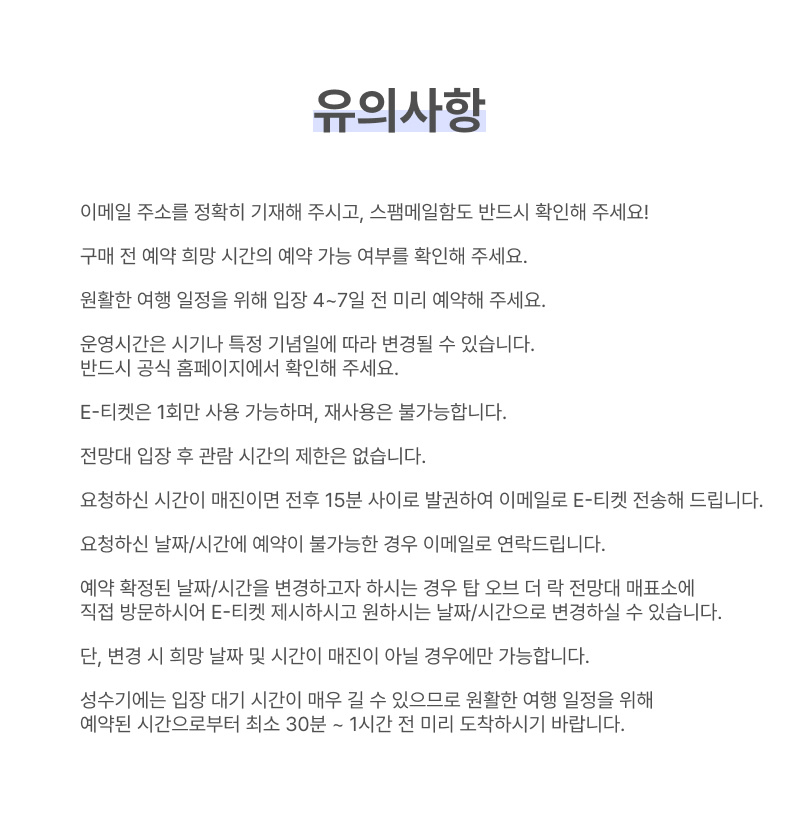 ・New Year's Eve(12/31) 오전 8:00 ~ 오후 11:00 (마지막 입장시간 오후 10:10)