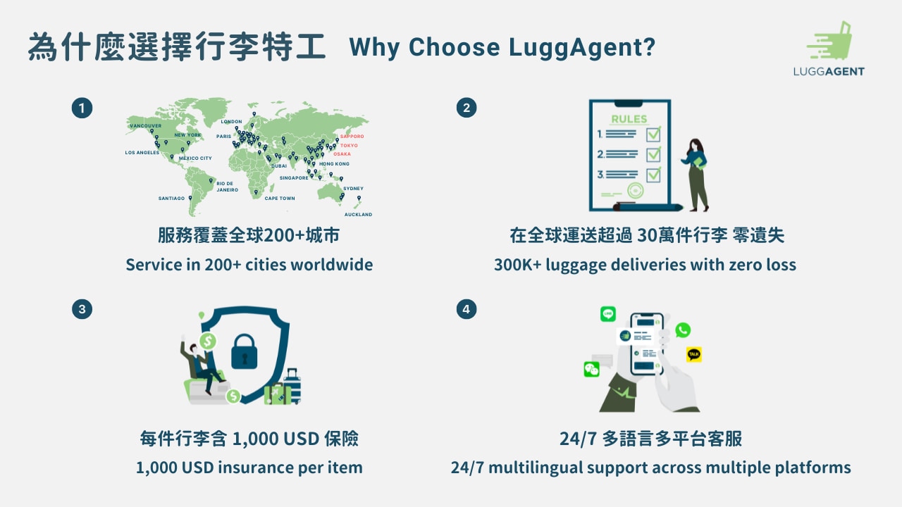 ・ 전 세계 200개 이상의 도시에 서비스를 제공하며, 30만 개 이상의 수하물을 분실률 0%로 안전하게 배송합니다.