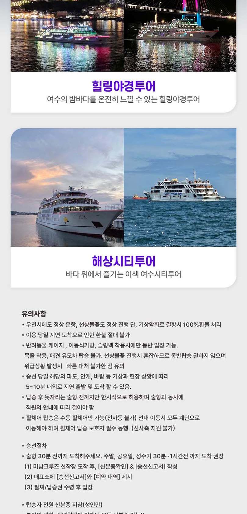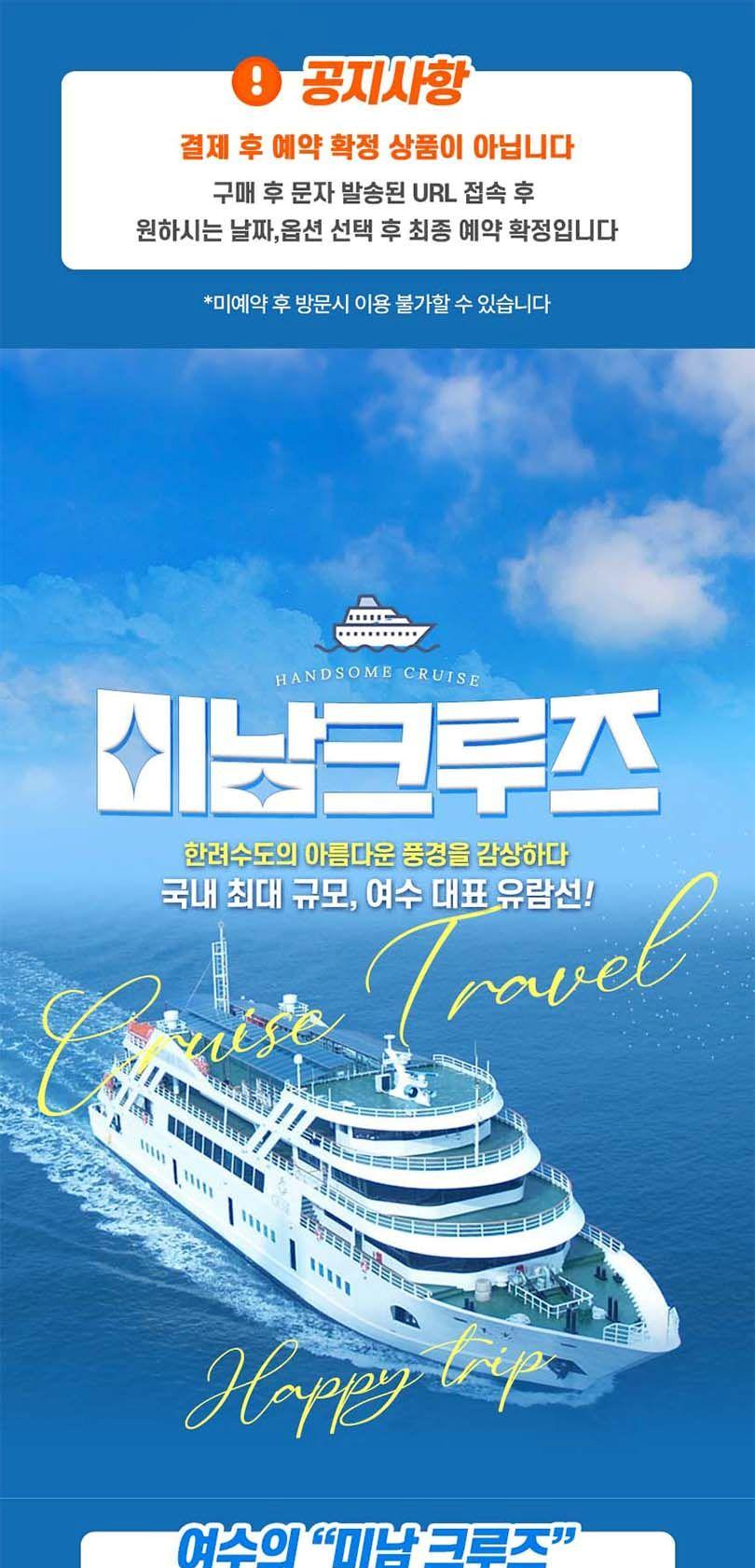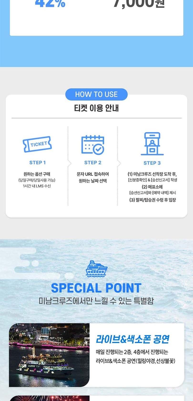 ・ 이용 방법 : 미남크루즈 선착장 도착 후, [신분증확인] & [승선신고서] 작성 매표소에 [승선신고서]와 [예약 내역] 제시 탑승권 수령 후 입장