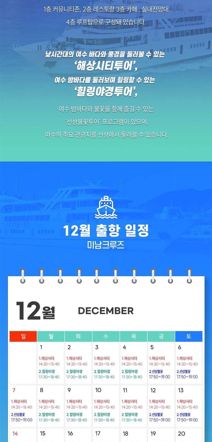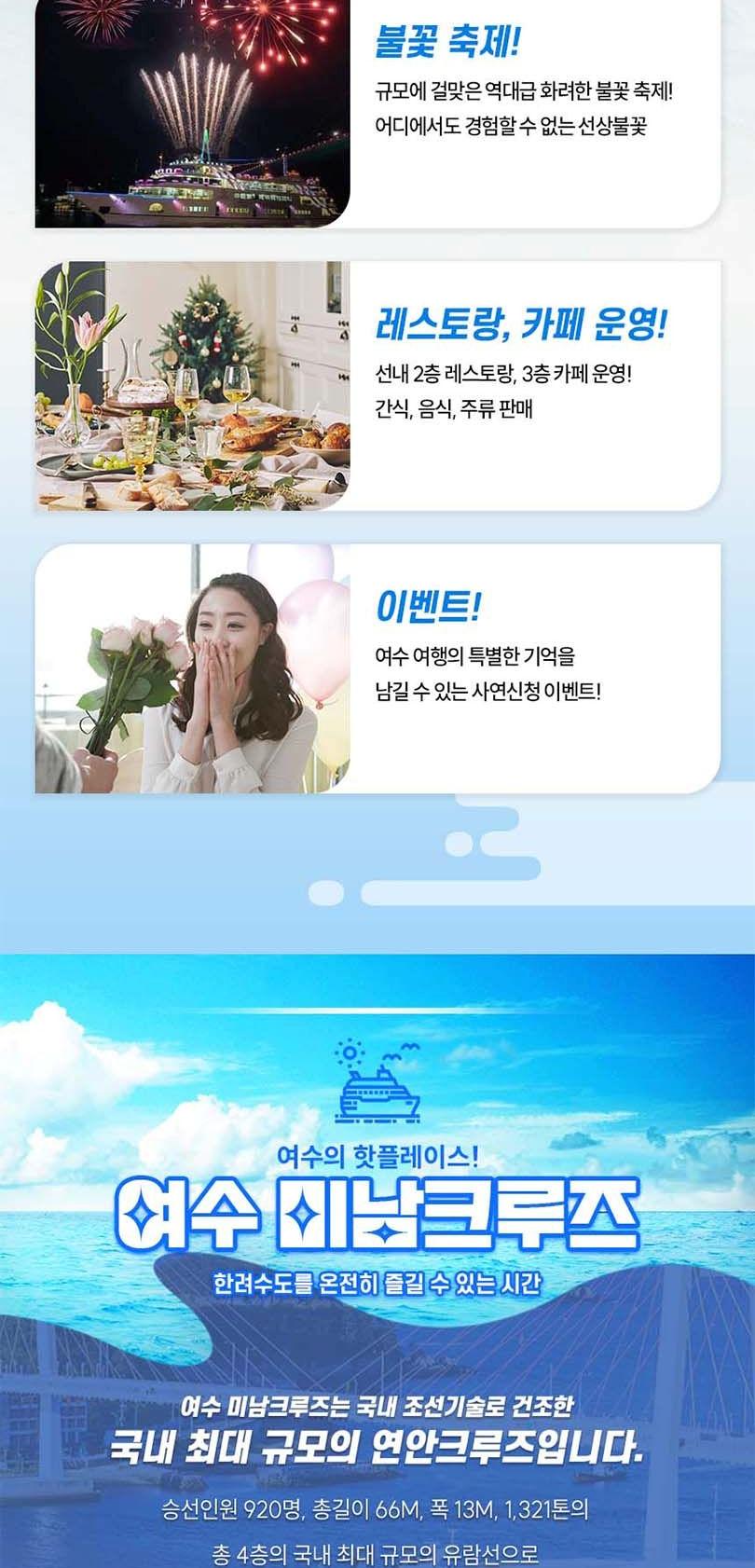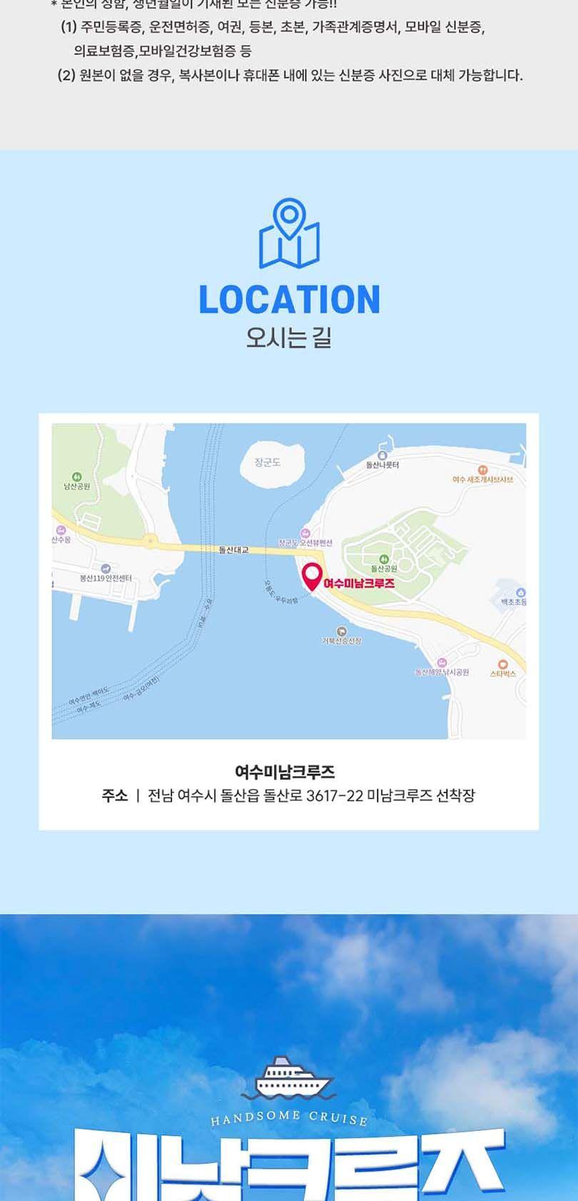 ・ 이용 방법 : 미남크루즈 선착장 도착 후, [신분증확인] & [승선신고서] 작성 매표소에 [승선신고서]와 [예약 내역] 제시 탑승권 수령 후 입장