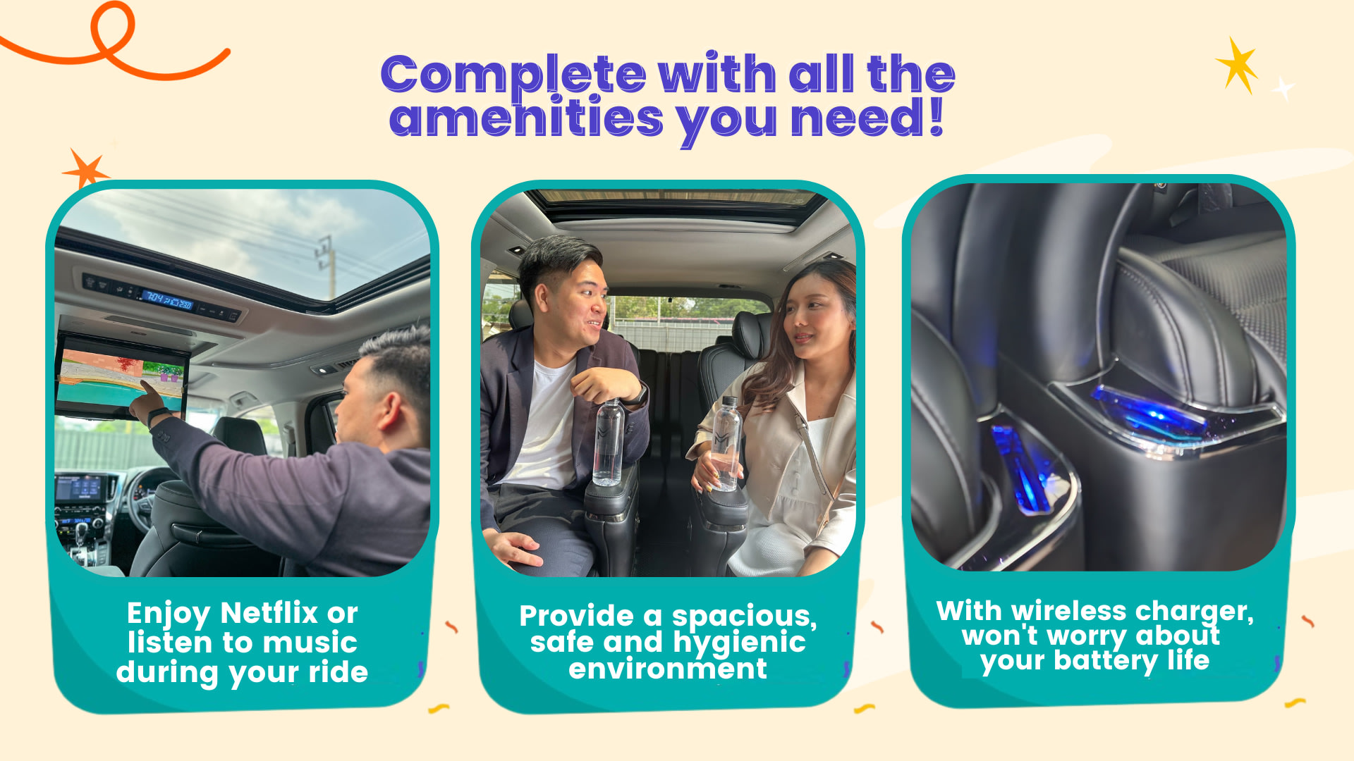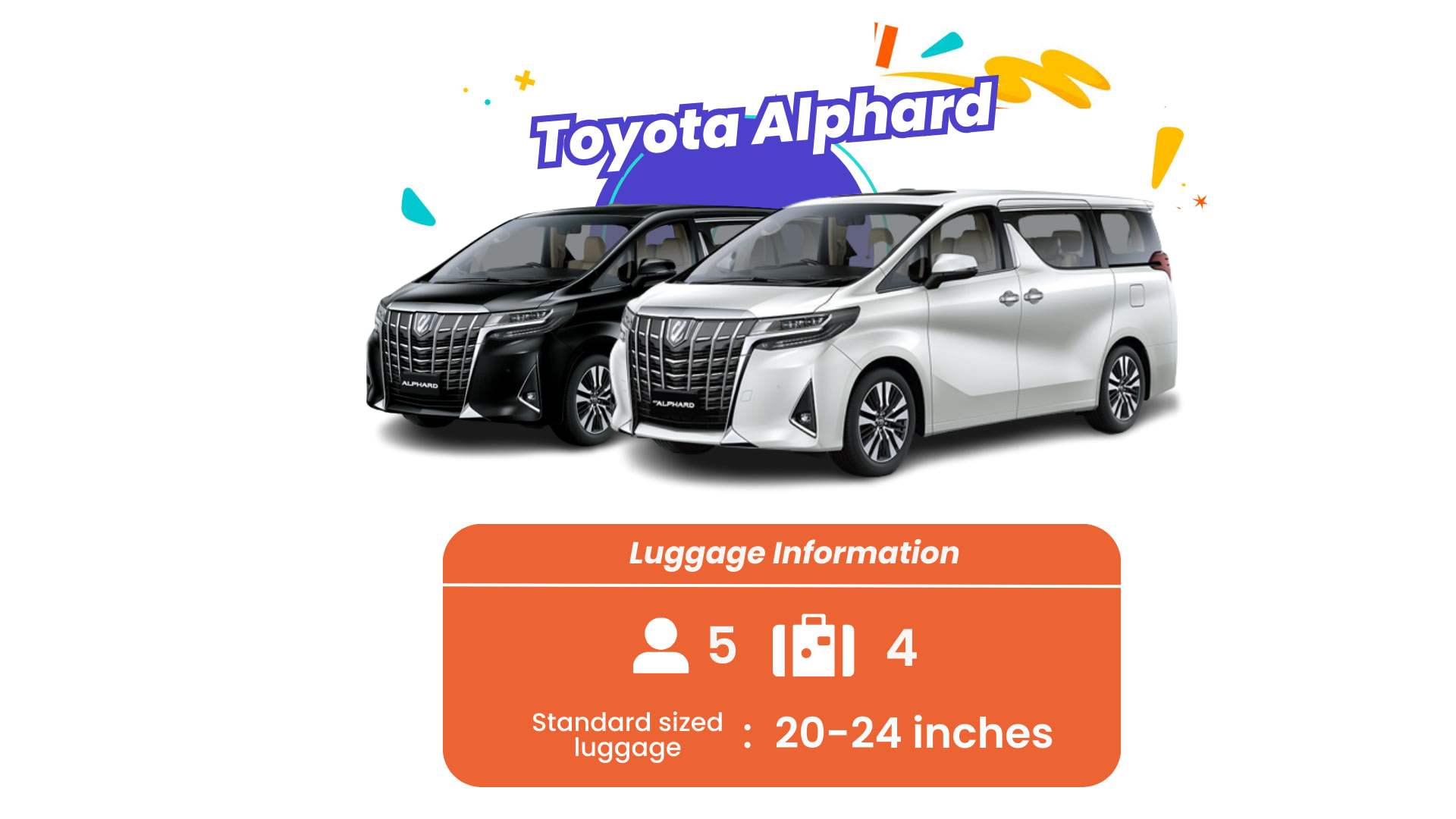 ・ 올인클루시브 가격에는 편안한 좌석과 넉넉한 수하물 공간을 갖춘 Toyota Alphard 밴의 고급스러운 탑승이 포함되어 있습니다.