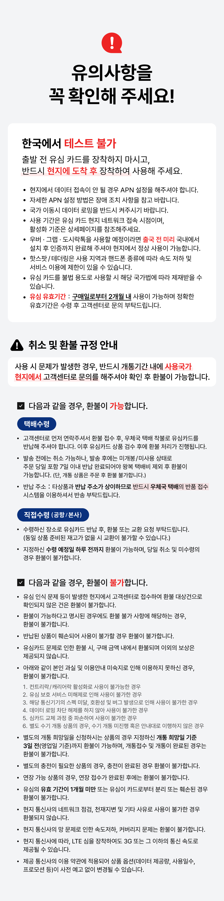 ・① 단말기 컨트리락 미해지, 휴대폰 보호서비스 가입, 데이터로밍 차단 시 해외유심 사용이 어렵습니다.