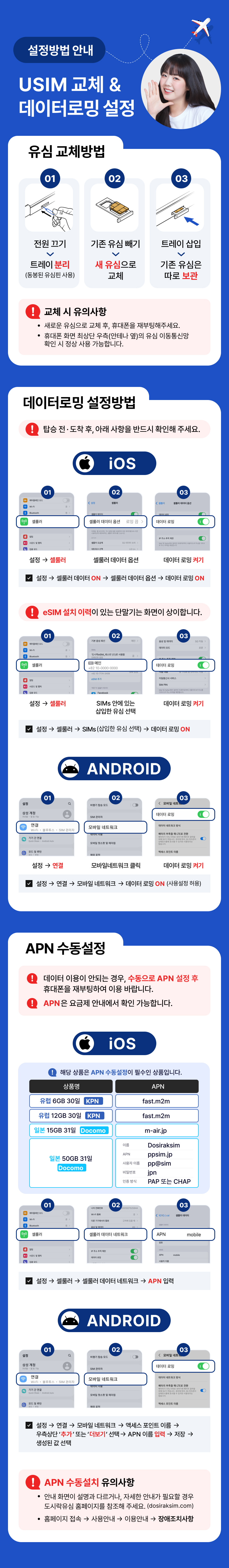 ・반드시 현지에서 유심 교체 이후에 데이터 로밍을 켜 주시기 바랍니다(데이터 로밍을 먼저 킨 후 유심 교체 시 로밍요금이 부과될 수 있습니다)