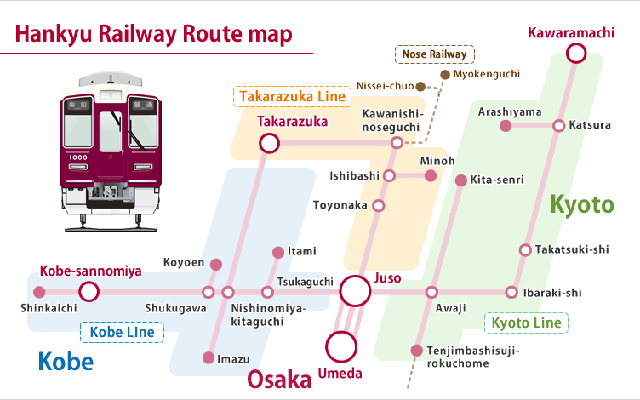 한큐 라인을 타고 오사카, 교토, 그리고 고베를 여행하세요.