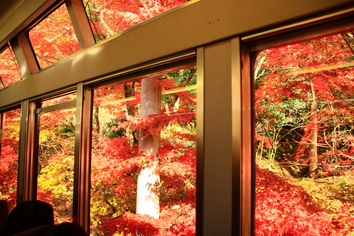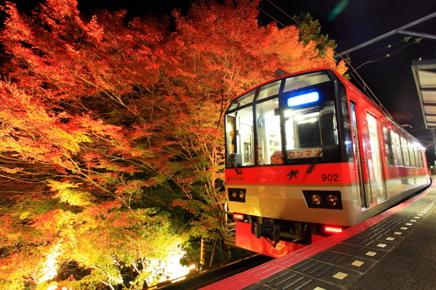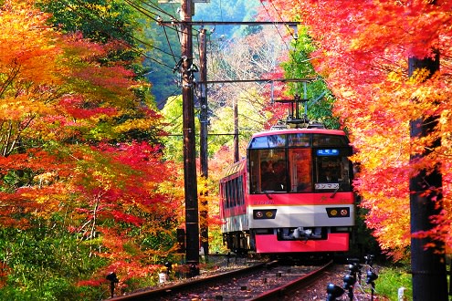 ・구라마 방면으로 이용 시에는 이치하라역-니노세역 사이를 지나는 ‘단풍 터널’이라 불리는 장소가 있습니다. 약 250m 구간이 280여 그루의 다양한 단풍나무로 둘러싸여 초여름에는 ‘푸른 단풍’을 가을에는 ‘붉은 단풍’이 차창 가득 펼쳐지는 광경을 보실 수 있습니다.