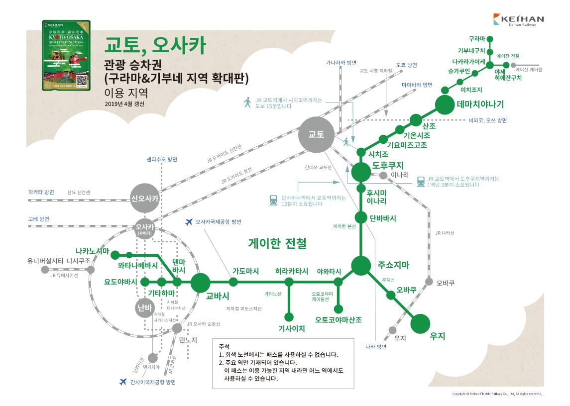 ・게이한 전철은 교토, 오사카를 연결하는 노선으로써, 이 패스를 이용해서 오사카성, 후시미 이나리 신사, 기온, 기요미즈데라, 시모가모 신사 등 다양한 관광 명소로 갈 수 있어요.
