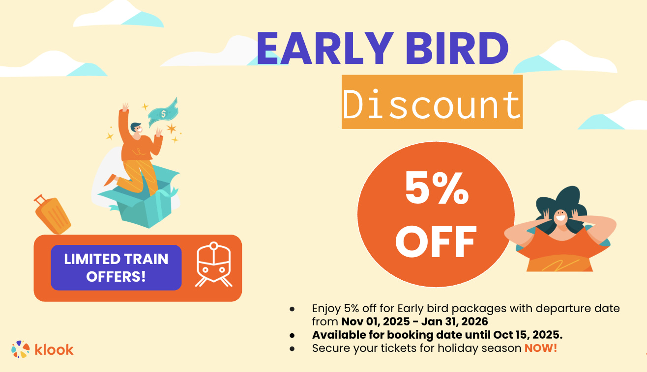 ・ 기간 한정 얼리버드 프로모션:2025년 11월 1일-2026년 1월 31일 중 출발하는 얼리버드 패키지를 구매하고 5% 할인 혜택을 누려보세요. 2025년 10월 15일까지 완료된 예약 건에 한해 적용 가능합니다.