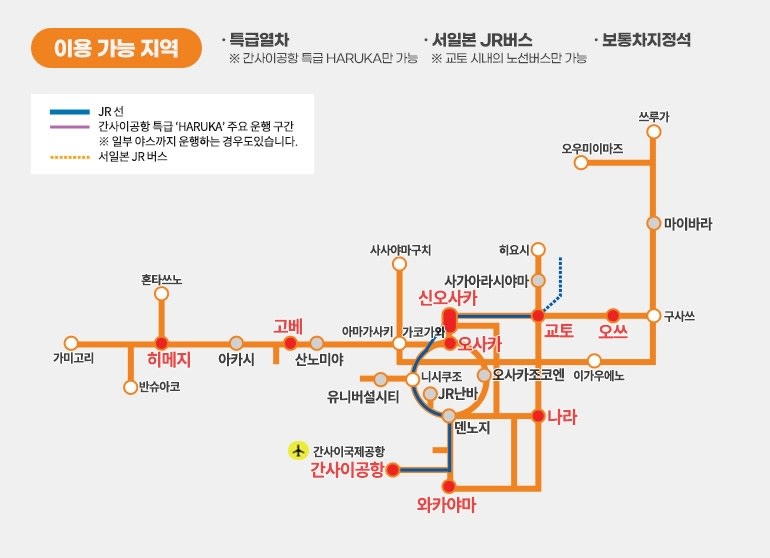 ・JR 간사이 패스 하나로 오사카, 교토, 고베, 나라, 히메지, 와카야마, 오쓰 등 간사이 주요 지역과 간사이특급 HARUKA를 이 티켓 하나로 자유롭게! 이용할 수 있습니다.
