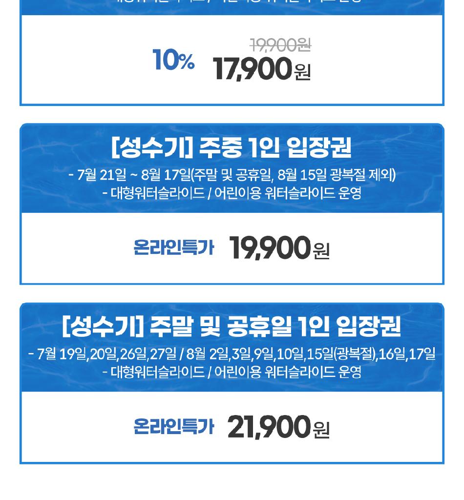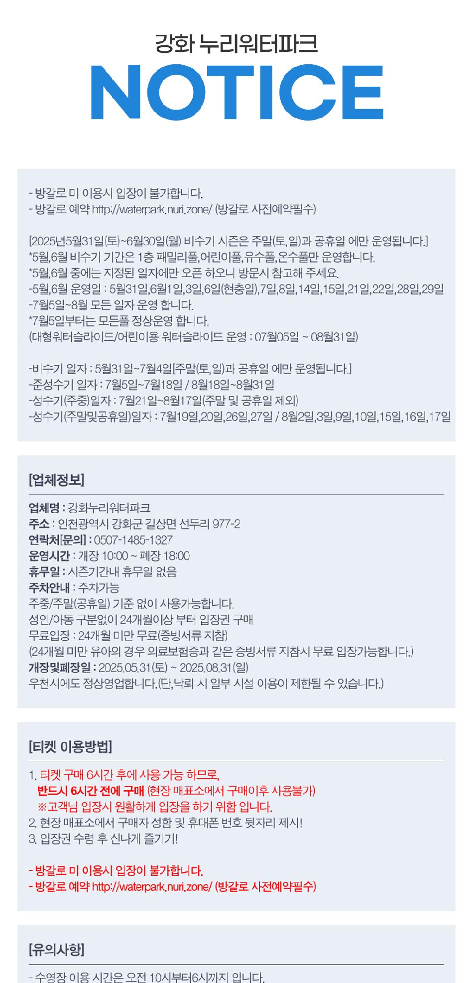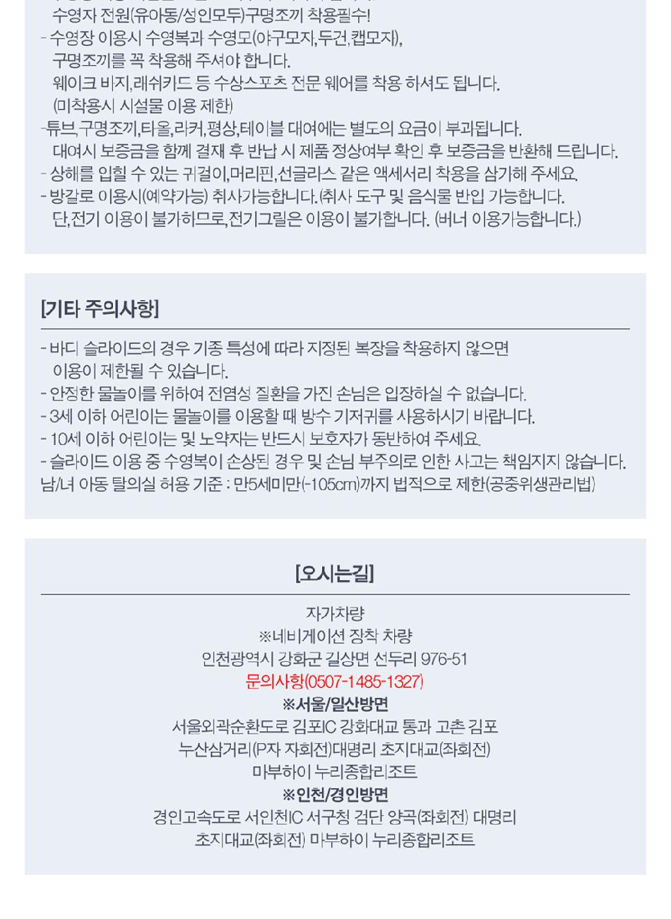 ・ 당일이용 가능여부 : 당일 이용 가능 방문 6시간 전 온라인 구매, 방갈로 사전 예약 필수