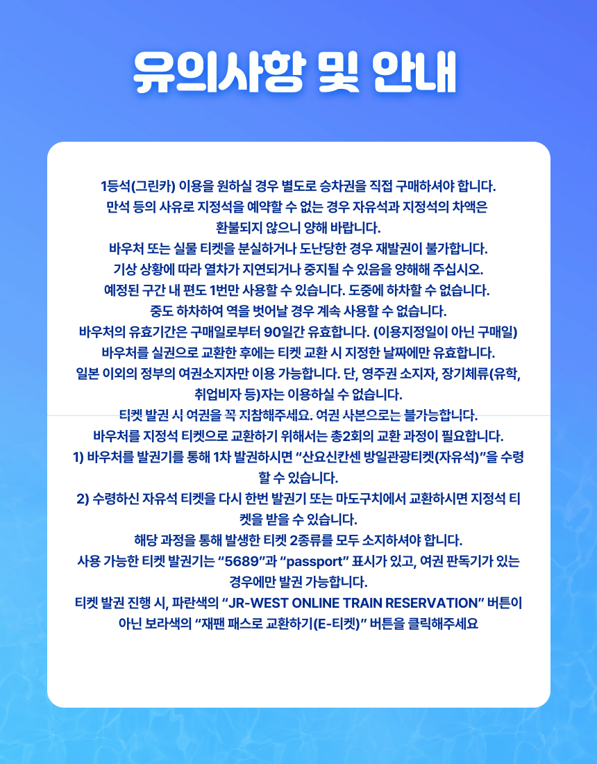 ・티켓교환처는 다음을 참고해 주세요: https://www.westjr.co.jp/global/kr/ticket/pass/shop/pdf/OWE_KR.PDF