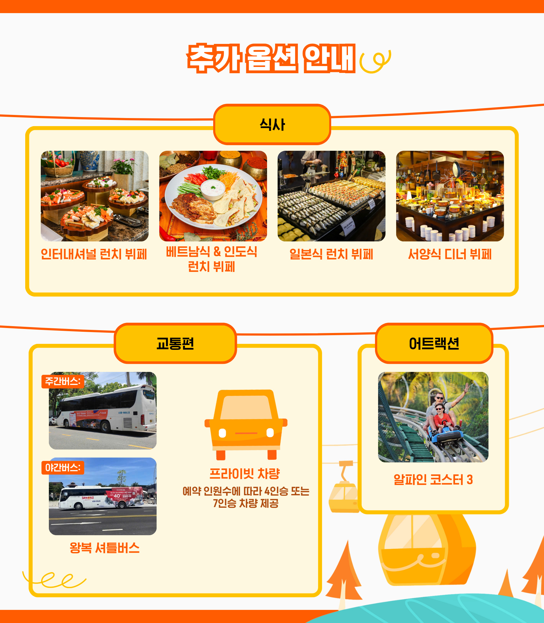 알파인 코스터 3을 타고 숲이 우거진 경사면을 질주하며 짜릿한 스릴과 아름다운 산의 절경을 만끽하세요! 세계 각국의 다양한 요리는 물론 할랄 메뉴까지 즐길 수 있는 뷔페도 있어 허기진 배를 채울 수도 있어요. 다낭에서 바나힐까지는 왕복 셔틀버스를 이용하면 간편하게 이동할 수 있습니다. 보다 여유롭고 편안한 이동을 원하신다면 프라이빗 차량 서비스를 이용해보세요.