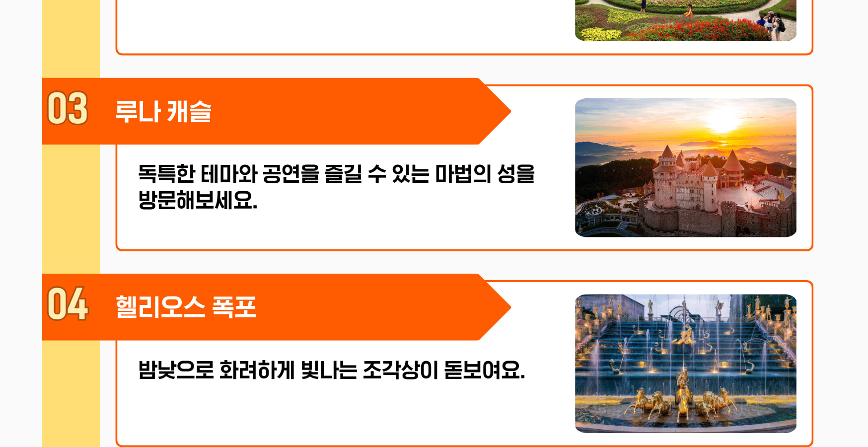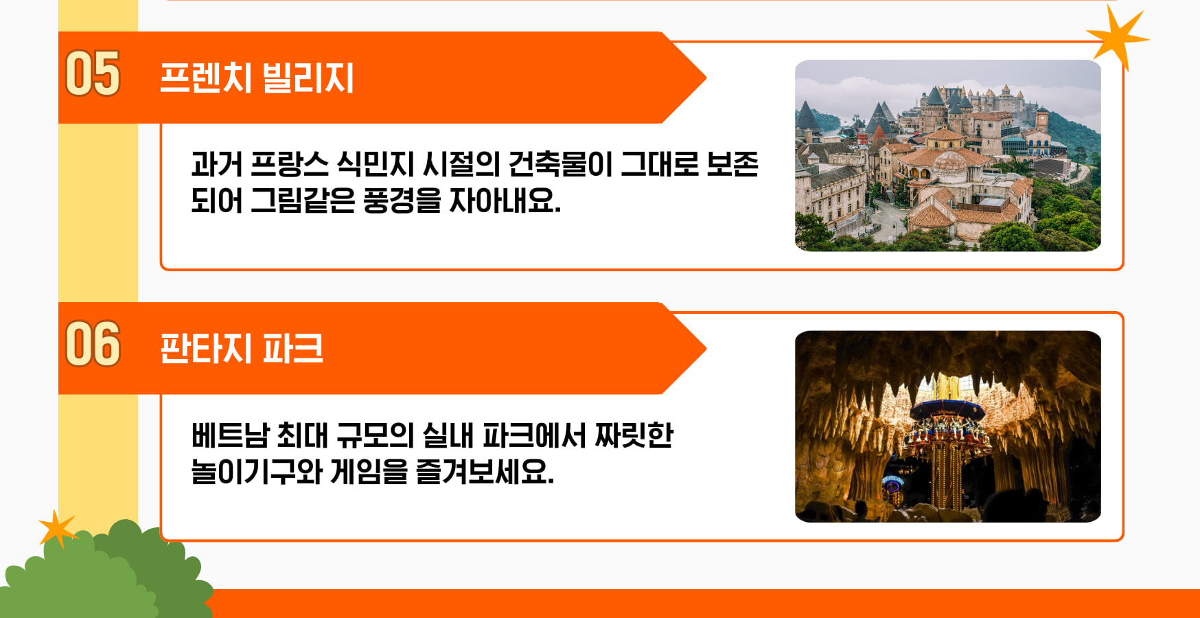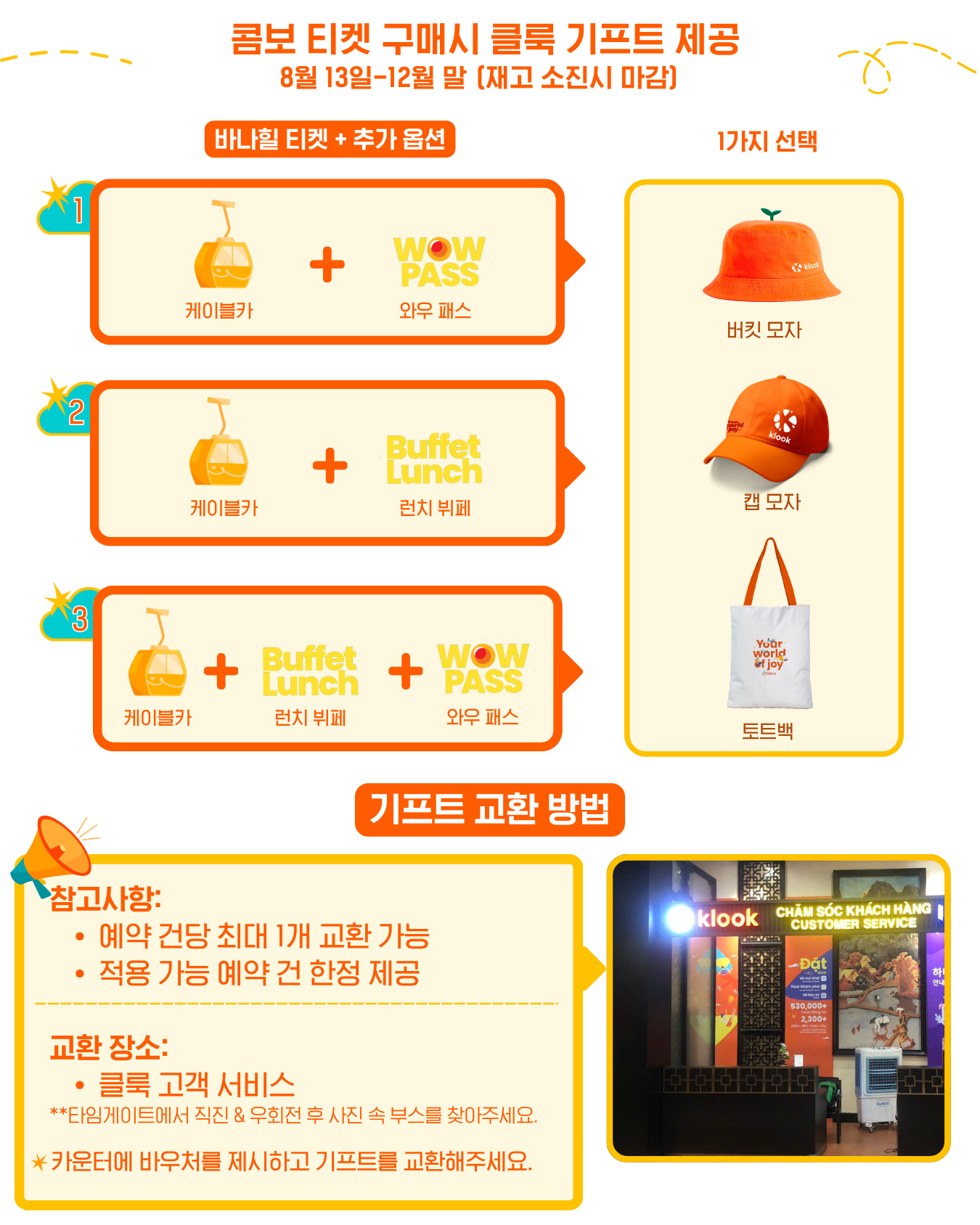 ・ 케이블카 탑승:바나힐 케이블카를 타고 쭈아산 정상까지 오르며 울창한 숲과 완만한 산이 어우러진 장관을 감상해보세요. ・ 필수 방문 명소:프렌치 빌리지를 거닐고 골든 브리지와 드베이 와인 셀러등의 대표 명소들을 방문해보세요. ・ 어트랙션 & 액티비티:판타지 파크, 알파인 코스터, 툼스톤 사원 등 남녀노소 모두가 좋아할 어트랙션이 가득해요. ・ 다이닝 옵션:포시즌스 뷔페 레스토랑의 베트남식 & 한국식 요리 또는 바라타 레스토랑의 베트남식 및 할랄 인증 인도식 요리 등 다양한 옵션의 런치 뷔페를 즐겨보세요.