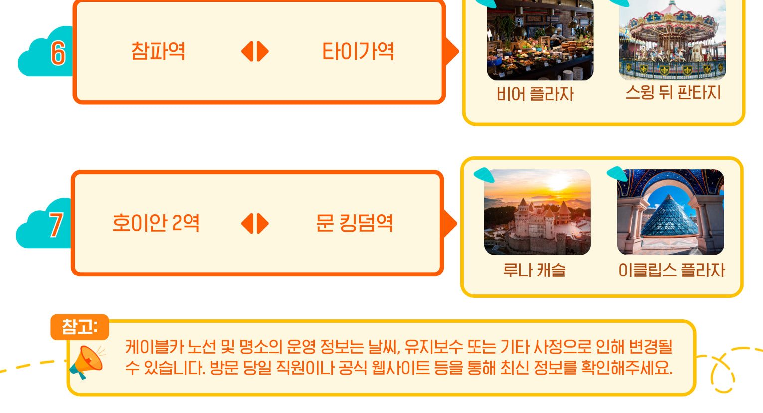 곧 방문할 계획이신가요? 일명 손 모양 다리로 알려진 골든 브리지로 바로 가고 싶으신 경우 호이안역에서 케이블카를 탑승하는 것을 추천드려요. 유럽풍의 프렌치 빌리지를 먼저 둘러보고 싶다면 떡띠엔역 또는 참파역에서 탑승하면 편리하게 방문할 수 있답니다.