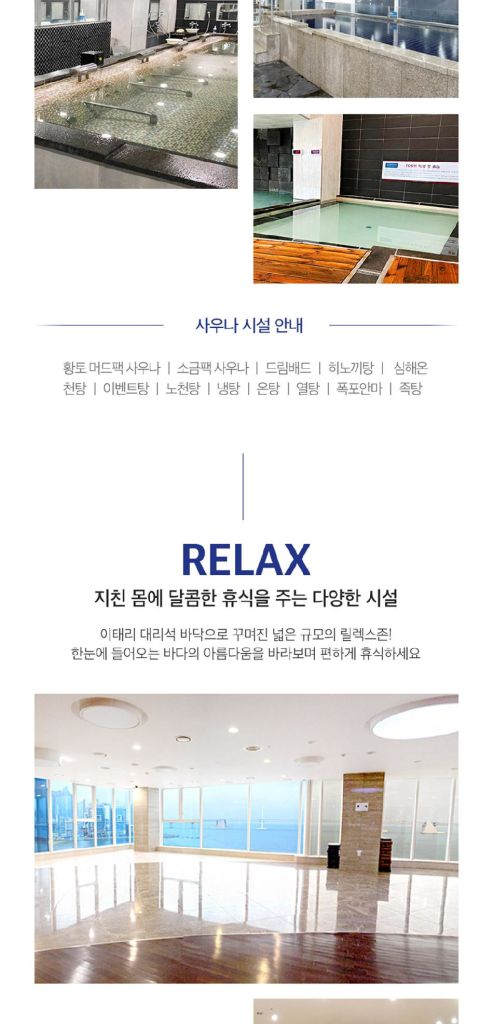 찜질방, 썬텐장 등 다양한 시설이 준비되어있는 릴렉스존도 놓치지 마세요.