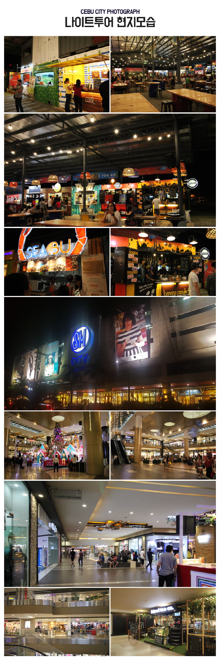 ・우리에게도 익숙한 대형 브랜드는 기본! 다양한 먹거리와 쇼핑, 볼거리를 한 번에 즐겨보세요! ・최대 규모의 식료품 매장, 영화관, 환전센터, 면세점, 서점까지 없는 게 없는 SM 쇼핑몰 센터와 시원한 맥주 한 잔과 어울리는 먹음직스러운 각국의 음식들과 행복한 여행의 기억을 남길 수 있는 최고의 플레이스 야시장입니다.