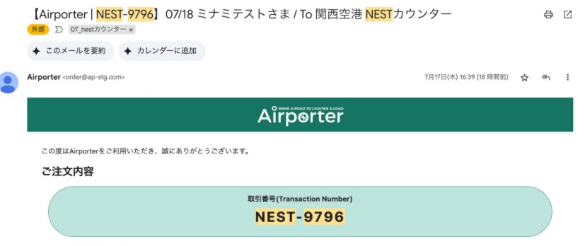 ・ 메일에 기재되어 있는 주문번호 (거래번호) 를 N・E・S・T 간사이 공항 카운터 직원에게 제시하여 주시기를 바랍니다.