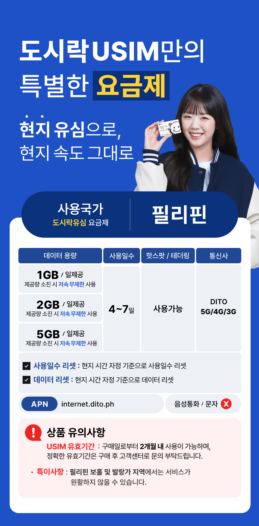 ・반드시 현지에서 유심 교체 이후에 데이터 로밍을 켜 주시기 바랍니다(데이터 로밍을 먼저 킨 후 유심 교체 시 로밍요금이 부과될 수 있습니다)