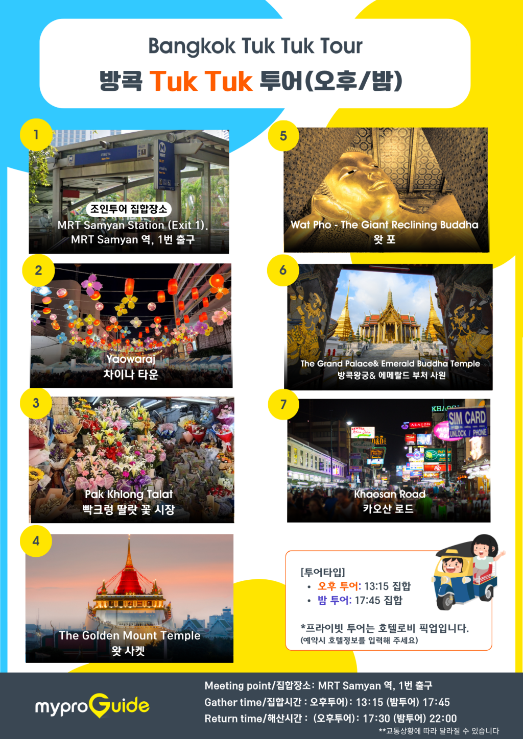 오후 투어와 밤 투어로 나눠져있는 이번투어는 태국 로컬 교통 수단인 툭툭을 타고 가이드와 함께 방콕 이곳 저곳을 탐험해 볼 수 있습니다.태국의 공기를 느끼면서 다양한 사원들과 방콕 도시를 느껴보고 사진으로 남겨보세요!