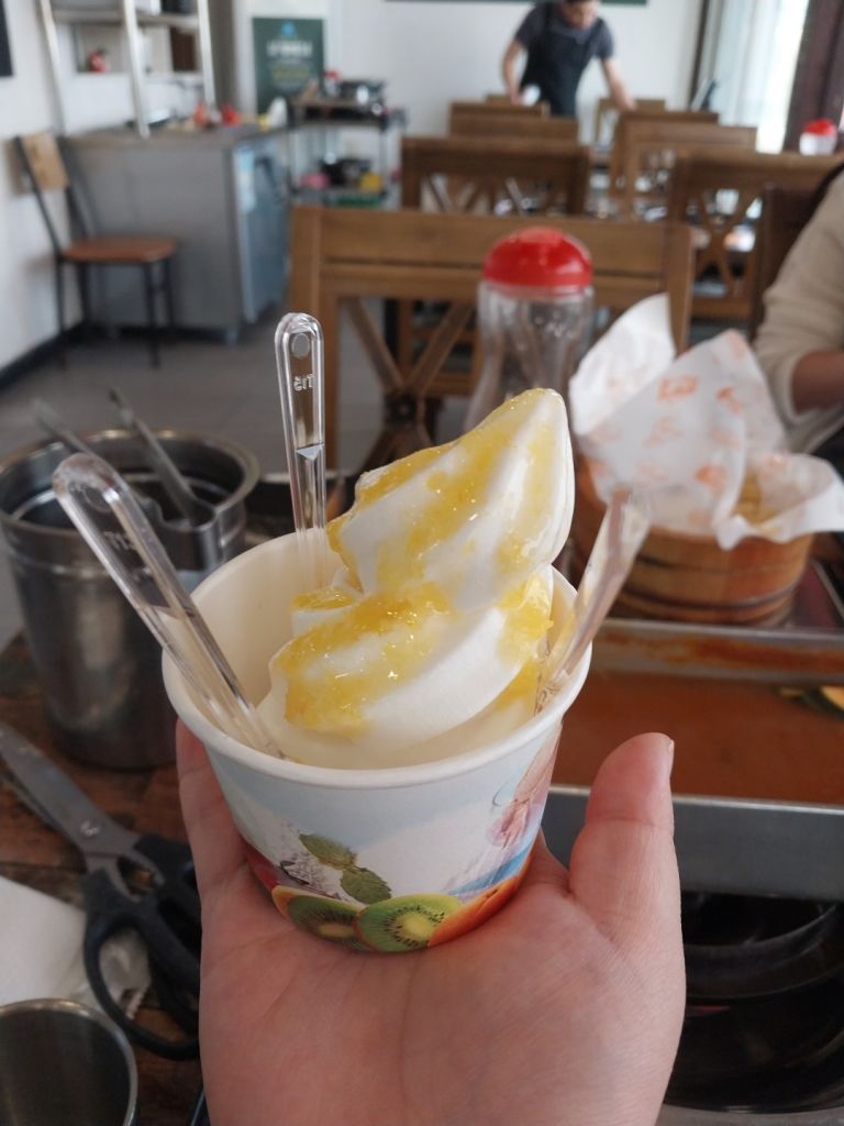 다먹고 네이버리뷰를 써주면 한라봉아이스크림을 주시는데 한라봉청?같은게 뿌려진 소프트아이스크림이었어요 이게 생각보다 너무 맛있더라고요 해물라면의 마지막을 깔끔하게 정리해주는 맛이었어요