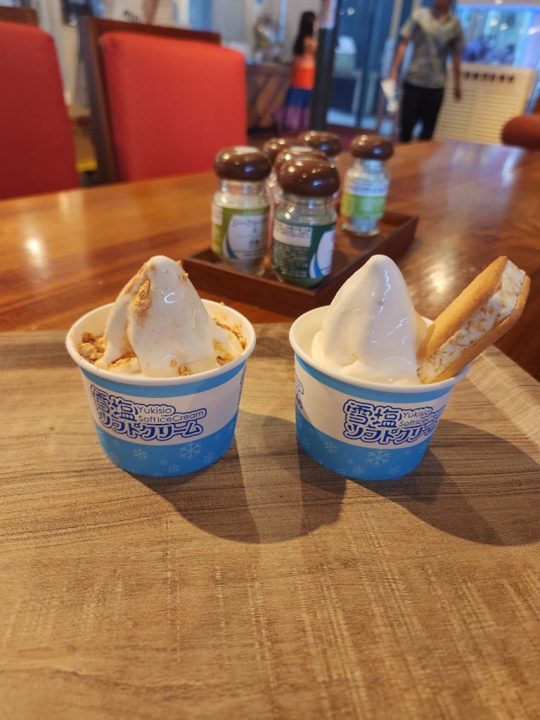 유키시오 제염소에서 소금 스크럽? 손이 뽀득뽀득해져요 아이스크림도 맛있어요 나와있는 소금 뿌려서 먹는데 맛있어요 아이스크림에는 말차소금이 제일 굳