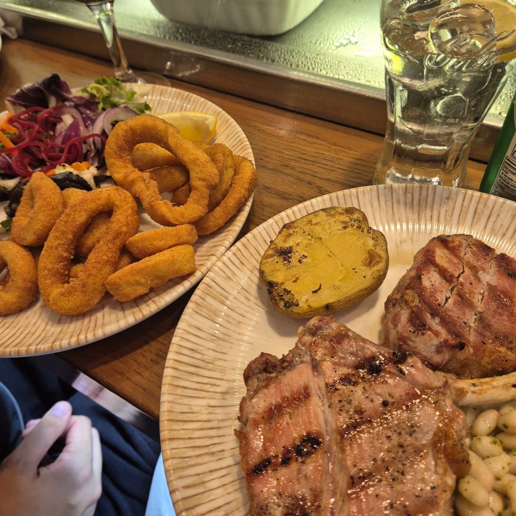 빠에야는 너무 조미료맛..? 시판소스맛이 확 났어요ㅜ 케첩에 비벼먹으니까 맛있었어요..ㅋㅋㅋ 오징어 튀김은 왕 맛있긴했어요. 이베리코 스테이크는 소소..