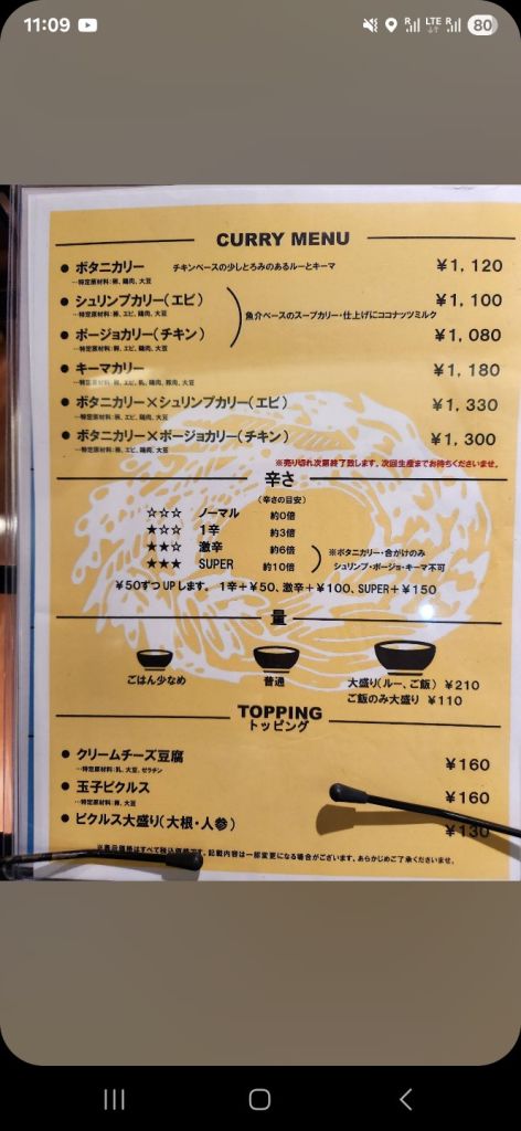 나는 새우카레, 밥양 보통, 맵기 1단계에 두부치즈인지 크림치즈인지 무슨 토핑 추가했다.
