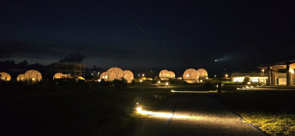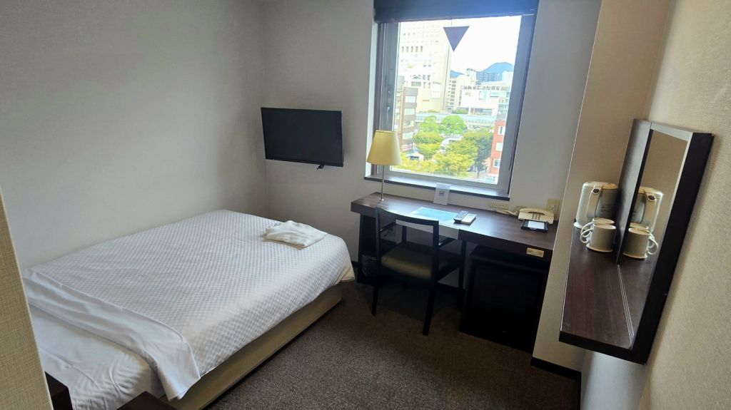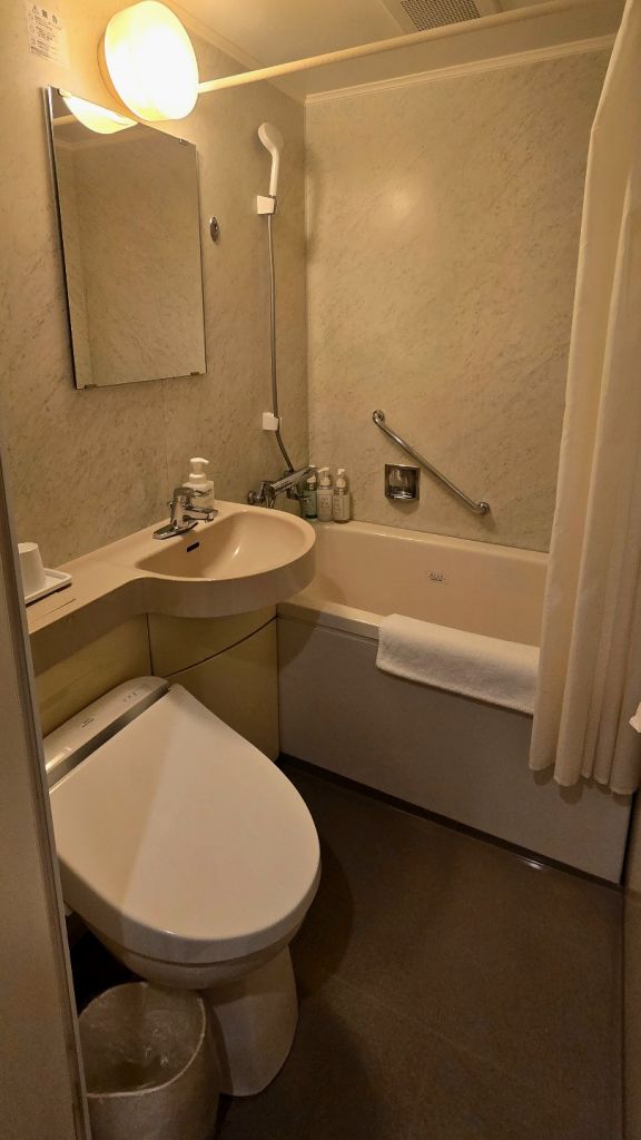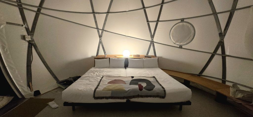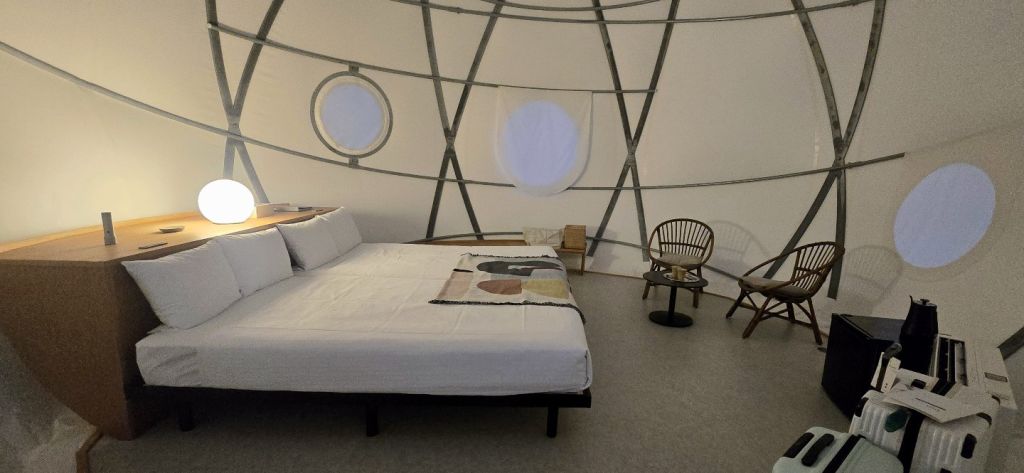 사진에서 보기에는 작아 보이는데, 일반적인 비즈니스 호텔보다 훨씬 큽니다. 높이도 엄청 높아서 답답한 느낌은 전혀 없어요. 침대 사이즈도 커서 불편함이 없고, 혹시 3명이 숙박하게 되면 간이침대를 하나 더 설치해주십니다. 안에는 기본적인 콘센트, 냉장고, 에어컨, 전기포트, 테이블과 의자가 있어서 큰 불편함은 없습니다. 다만, 방음은 잘 안되는 편이라 특유의 풀벌레 소리와 근처 전철 지나가는 소리, 하늘에서 비행기 지나가는 소리가 그대로 들렸어요. 저는 그런 부분도 낭만 있다고 생각해서 좋았지만, 호불호가 갈리는 부분이므로 참고해주세요!