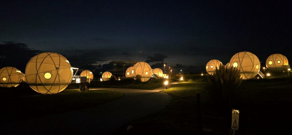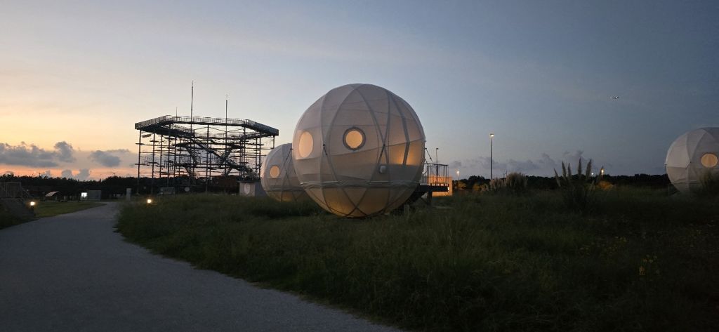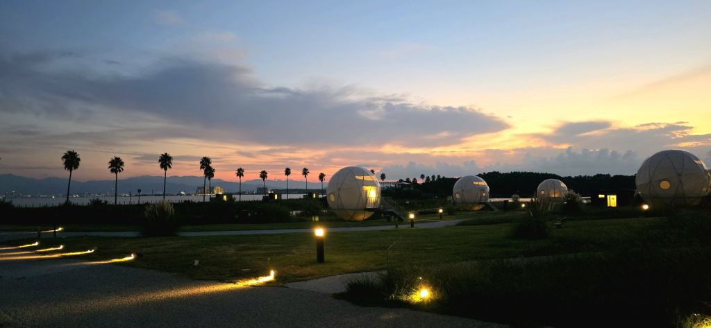 호불호가 극명하게 갈릴 것 같습니다. 일단 공원 내에 있고, 주변에 정말 아~무것도 없습니다. 흔한 편의점조차 없어요. 다만, 자전거로 10~20분 거리에 마린월드와 동물원이 있어서 근처 시설과 세트로 생각하신다면 나쁘지 않지만, 그렇지 않다면 후쿠오카 시내에서 약 1시간이나 걸리는 위치라 좋다고 할 수는 없습니다.