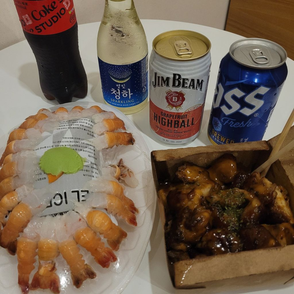 리스트 중에 정말 먹고 싶었던 딱새우회랑 닭다리 스테이크만 사왔는데 정말 맛있었다 ㅠㅠ