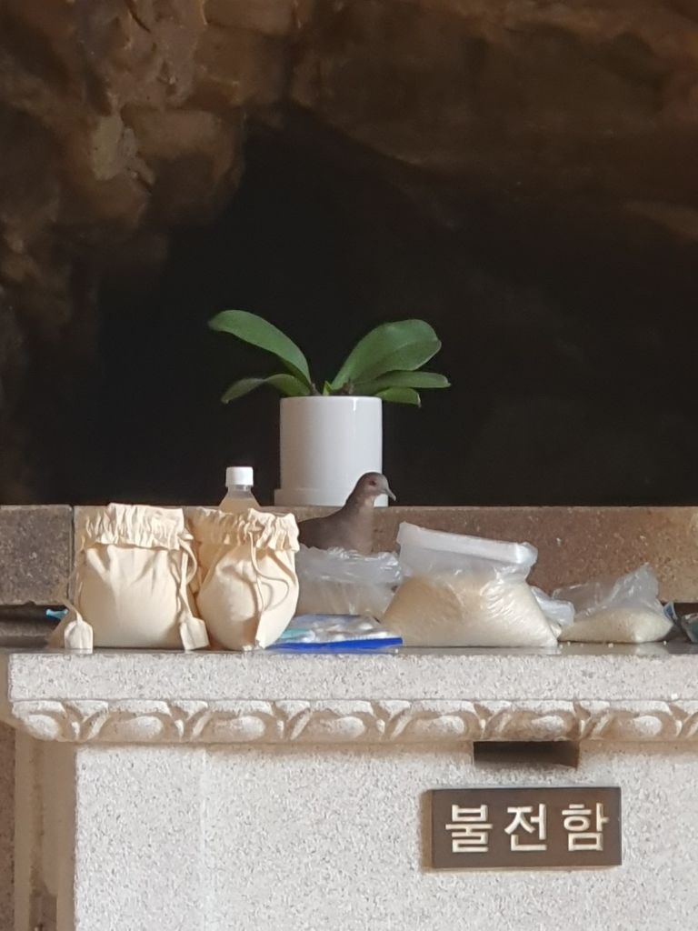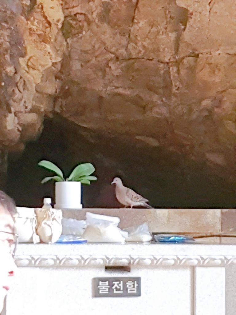 동굴에 앉아 쉬는데 비둘기가 식사중~먹으라고 아예 펼쳐놨네~세상에서 젤 배부른 비둘기일듯~