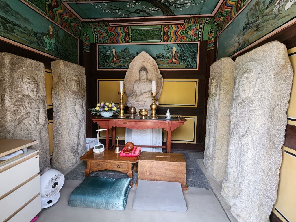내부 석조여래좌상을 중심으로 네개의 사천왕석주가 서있다