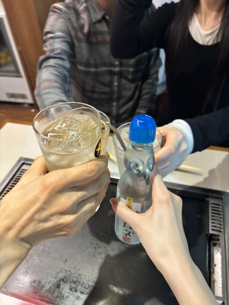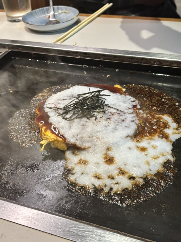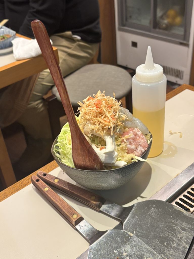 마늘 새우 몬자, 기본육수몬자 떡추가, 구름 마 오코노미야끼, 앙버터 팬케이크, 레몬사와, 하이볼 두 잔,라무네 주문.