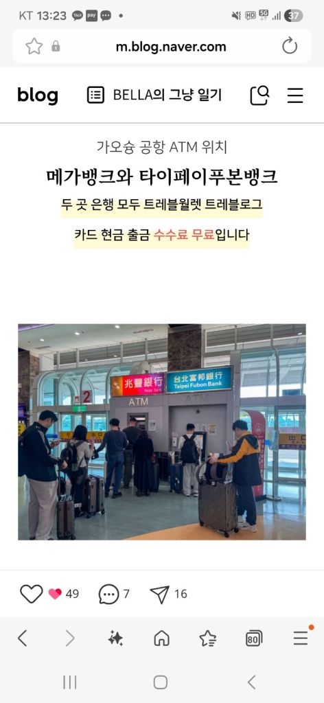 한국에서 하고 온 자동입국심사로 절차가 금방 끝났다. 가오슝 입국장은 작았는데 미리 구입한 이지카드 받고, atm에서 출금하고 나가면 바로 MRT연결되서 너무 편했다.