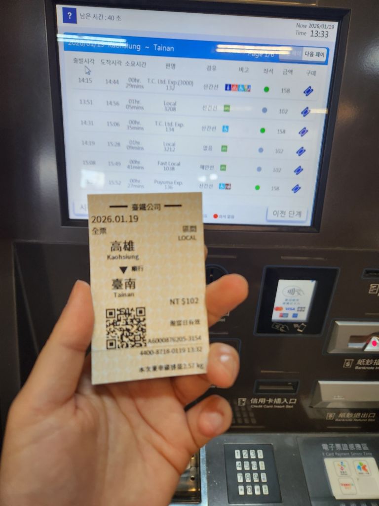 드뎌 타이난으로 출발!! 숙소에서 안 멀어서 걸어왔다. 티켓머신에 한국어가 있어서 어려울게 없지요ㅎㅎ 로컬기차로 탔고 입석이라지만 좌석이 많아서 쭉 앉아갔다.