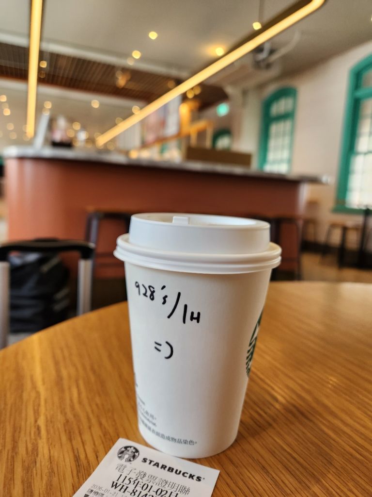타이난 도착한 순간부터 계획했던 곳이다. 건물이 일단 예쁘고 기차 타기 전에 맛난 음료를 먹고 싶었기 때문에. 아이스 호지차 라테를 시켰는데 따뜻한 걸 받았지만 의외로 따뜻한 게 먹고 싶었던 듯. 맛있었다. 그리고 컵에 저 :) 귀여워서 뭐 어때 싶었다. 컵홀더(빼이따이)도 달라고 해서 받았다.